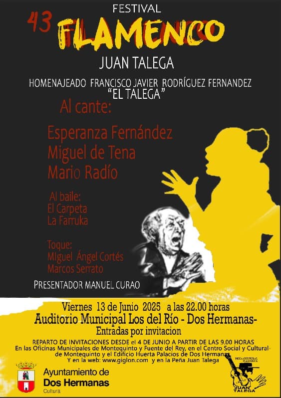FESTIVAL FLAMENCO JUAN TALEGA 2025 FESTIVAL FLAMENCO JUAN TALEGA Peña Juan Talega2025-06-14T11:04:35+02:00 ¡¡Comparte esta noticia en tus redes!! FacebookXWhatsAppCorreo electrónico Sobre el Autor: Peña Juan Talega Artículos relacionados MELISMAS CORO DE NAVIDAD MELISMAS CORO DE NAVIDAD DIA 30 DE NOVIEMBRE 2025 A LAS 13.30 HORAS RECITAL MANUEL CESPEDES Y MARIO RADIO TOQUE MANUEL MONGE Galería DIA 30 DE NOVIEMBRE 2025 A LAS 13.30 HORAS RECITAL MANUEL CESPEDES Y MARIO RADIO TOQUE MANUEL MONGE DIA 29 NOVIEMBRE 2025 A LAS 13.30 HORAS RECITAL PACO MORILLO Y ANTONIO CARRION DIA 29 NOVIEMBRE 2025 A LAS 13.30 HORAS RECITAL PACO MORILLO Y ANTONIO CARRION DIA 28 NOVIEMBRE 2025 A LAS 21.30 HORAS RECITAL JAVIER ALLENDE Y JUAN JOSE BANDO DIA 28 NOVIEMBRE 2025 A LAS 21.30 HORAS RECITAL JAVIER ALLENDE Y JUAN JOSE BANDO MARTES 18 NOVIEMBRE 2025 A LA 19 HORAS INAGURACION DE LA ESTATUA DE JUAN TALEGA MARTES 18 NOVIEMBRE 2025 A LA 19 HORAS INAGURACION DE LA ESTATUA DE JUAN TALEGA Deja tu comentario Cancelar la respuestaComentar Guardar mi nombre, email y sitio web en este navegador para la próxima vez que comente. Δ